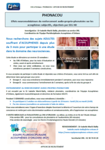 Par ailleurs, de nombreux musicothérapeutes (étudiants ou professionnels) souffrent de ces pathologies auditives ! Certains d’entre eux pourraient également participer à l’étude clinique PHONACOU comme patient. Le recrutement au CHU d’Orléans, débuté en mars 2025, se poursuit jusqu’en 2028. (affiche de recrutement en pièce jointe)